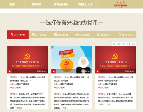 《十九大報(bào)告的十個(gè)為什么》、《社會(huì)主義有點(diǎn)潮》、《給90后講講馬克思》、《馬克思是對(duì)的》、《我是共產(chǎn)黨員》……“云黨課”學(xué)習(xí)平臺(tái)目前重點(diǎn)收錄了十九大精神系列解讀、最新最潮的系列微視頻、以及我黨十八大以來的黨建工作、治國(guó)理政等相關(guān)黨課學(xué)習(xí)視頻課程共計(jì)200余部,涵蓋黨建、政治、經(jīng)濟(jì)、文化、社會(huì)、外交等各個(gè)領(lǐng)域。平臺(tái)主要分為三大板塊:微黨課、黨課隨身聽、黨報(bào)天天讀,兼容PC端與手機(jī)端,方便廣大黨員干部及群眾多視角、多形式學(xué)習(xí)黨課內(nèi)容。