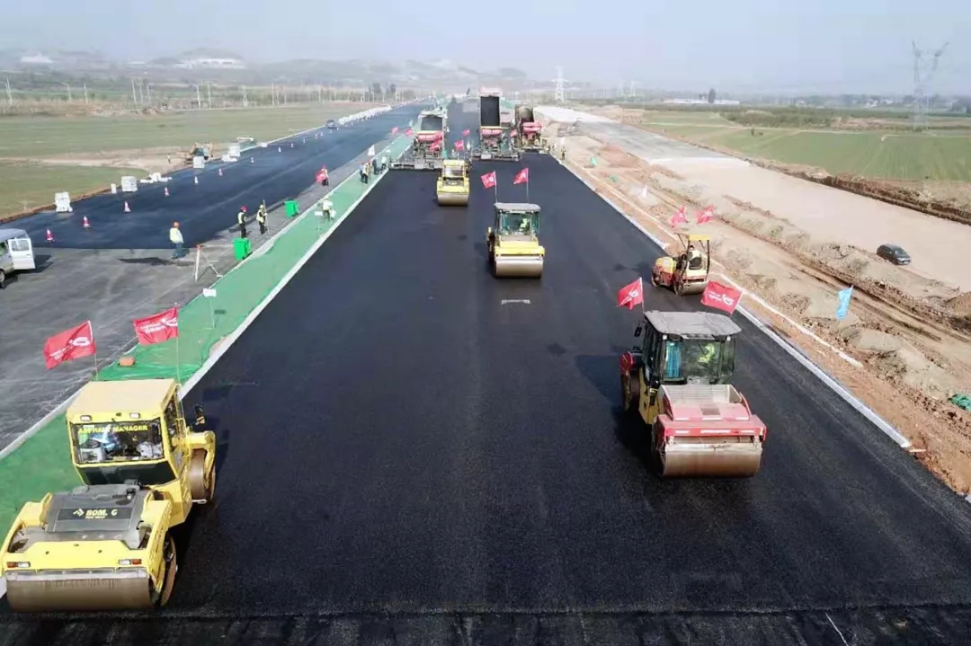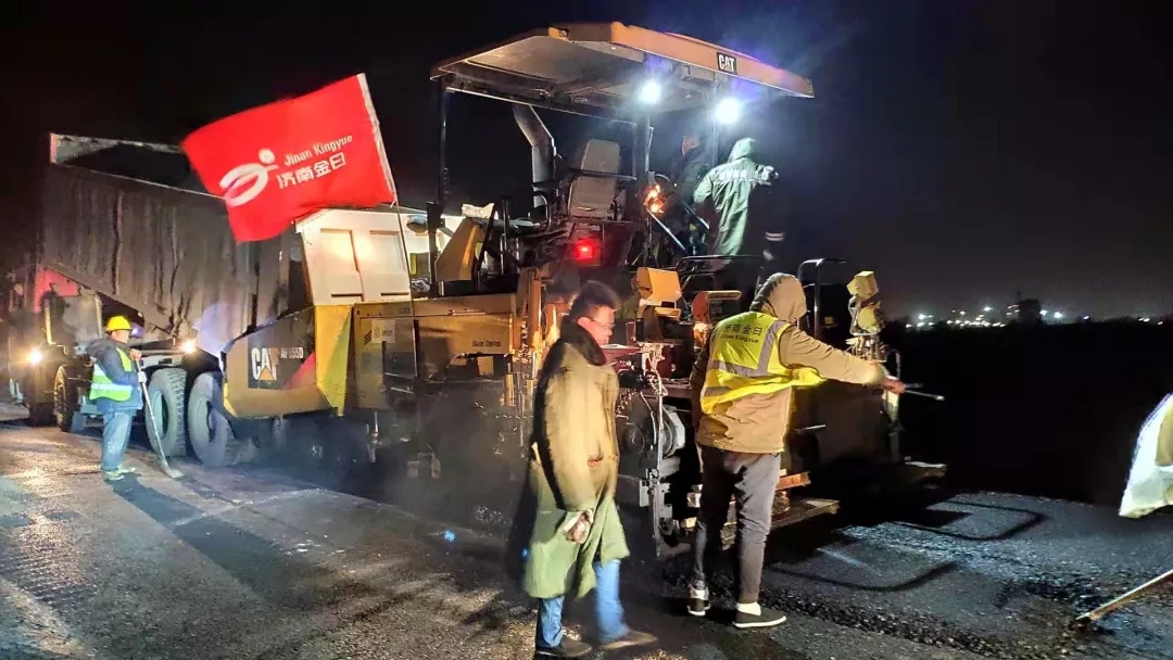 為確保項目建設進度,尤其是在寒潮低溫前確保水穩基層、瀝青面層節點工期,項目部技術人員奮戰在施工一線,晝夜趕工,掀起持續大干72小時施工熱潮。項目部合理規劃,根據情況及時調整施工方案,加大人力、物力投入,兩個水穩基層、兩個瀝青面層作業面同時進行施工。夜間施工中,一線建設者“挑燈夜戰”,攤鋪機、壓路機、裝載機等各種機械配合施工,形成了一條有序的機械操作流水線。同時,施工完成后,項目部進行自檢、監理檢測和業主抽檢,平整度、壓實度、厚度等各項指標全部合格,為項目后續路面施工奠定了扎實的基礎。