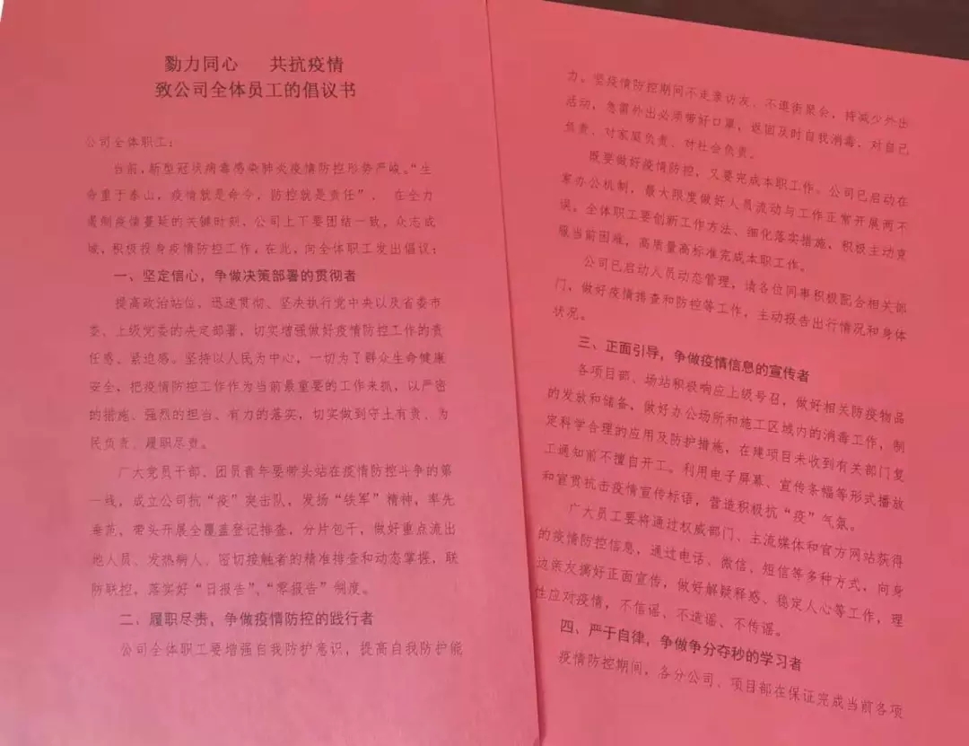 公司黨支部、團支部向公司全體職工發出倡議,爭做決策部署的貫徹者、疫情防控的踐行者、疫情信息的宣傳者、時間管理的學習者,勠力同心,共抗疫情!