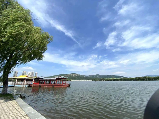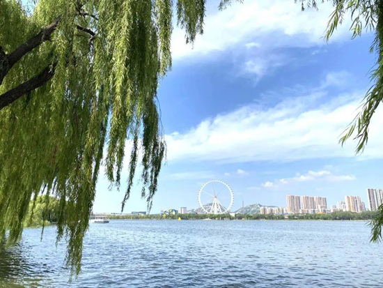 雨后的濟南園博園,藍天白云、岸綠湖清