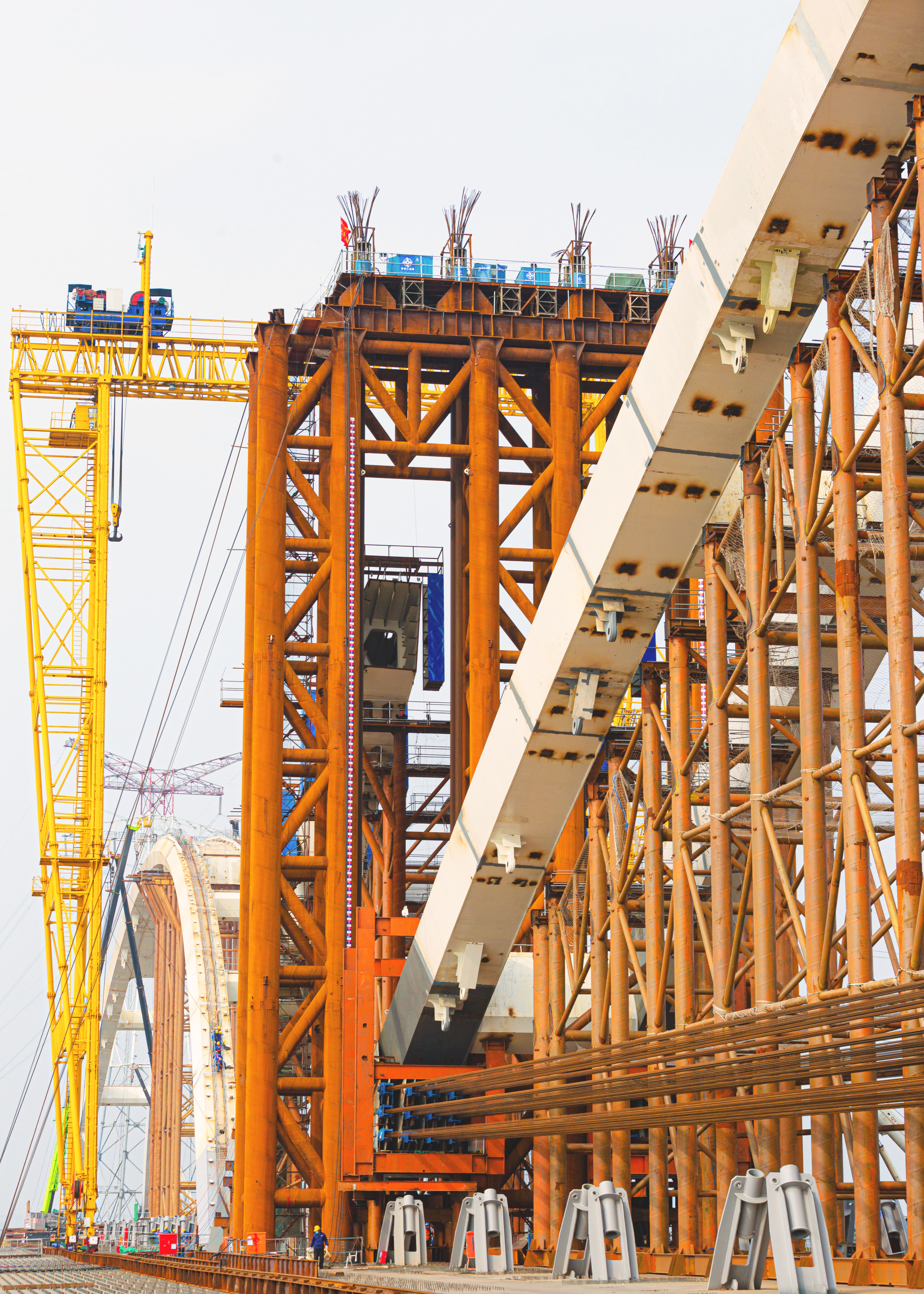 齊魯黃河大橋主跨420米拱肋提升是整個(gè)主橋施工難度最高、風(fēng)險(xiǎn)最大的關(guān)鍵節(jié)點(diǎn),其提升跨度為300米,提升重量達(dá)6800噸。在拱肋架設(shè)過(guò)程中,項(xiàng)目克服了超重構(gòu)件吊裝、拱肋節(jié)段安裝精度控制等重大難題,自主研發(fā)了120噸大規(guī)模龍門(mén)吊進(jìn)行超高拱肋節(jié)段架設(shè)作業(yè),并且項(xiàng)目引入了龍門(mén)吊運(yùn)行狀態(tài)在線監(jiān)測(cè)系統(tǒng),實(shí)時(shí)監(jiān)測(cè)門(mén)吊運(yùn)行狀態(tài),確保施工安全;研發(fā)設(shè)計(jì)的自動(dòng)化姿態(tài)調(diào)整吊具+三向千斤頂精調(diào)系統(tǒng),實(shí)現(xiàn)拱肋節(jié)段位置毫米級(jí)誤差安裝。
