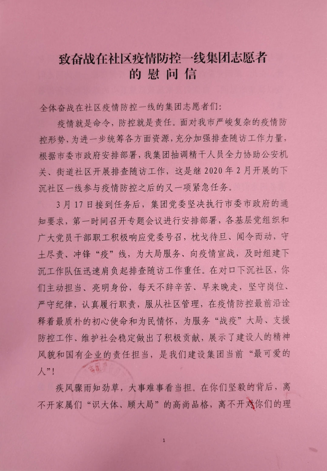 致奮戰(zhàn)在社區(qū)疫情防控一線集團志愿者的慰問信