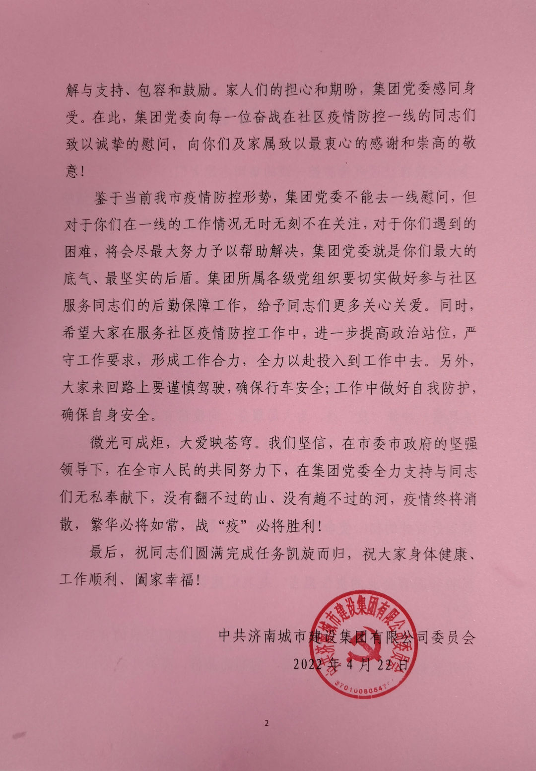 鑒于當前我市疫情防控形勢,集團黨委不能去一線慰問,但對于你們在一線的工作情況無時無刻不在關注,對于你們遇到的困難,將會盡最大努力予以幫助解決,集團黨委就是你們最大的底氣、最堅實的后盾。集團所屬各級黨組織要切實做好參與社區(qū)服務同志們的后勤保障工作,給予同志們更多關心關愛。同時,希望大家在服務社區(qū)疫情防控工作中,進一步提高政治站位,嚴守工作要求,形成工作合力,全力以赴投入到工作中去。另外,大家來回路上要謹慎駕駛,確保行車安全;工作中做好自我防護,確保自身安全。