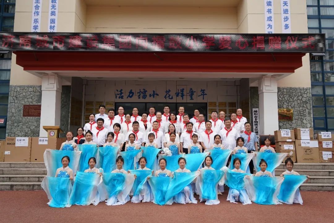 在擂鼓鎮小學,集團向學校捐贈了學習用品及辦公用品,擂鼓鎮向集團贈送錦旗,孩子們為大家獻上了寓意吉祥美好的羌紅。
