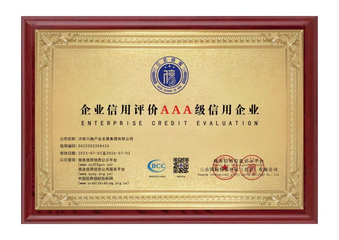 “信用等級認證”是由行業專家對公司近三年整體運營管理情況進行全面嚴苛的綜合評定,AAA級是企業的最高信用評價級別。該信用評價結果同步在商務信用信息公示平臺、商業信用信息公共服務平臺、中國信用招標投標網平臺等信用平臺進行公示。