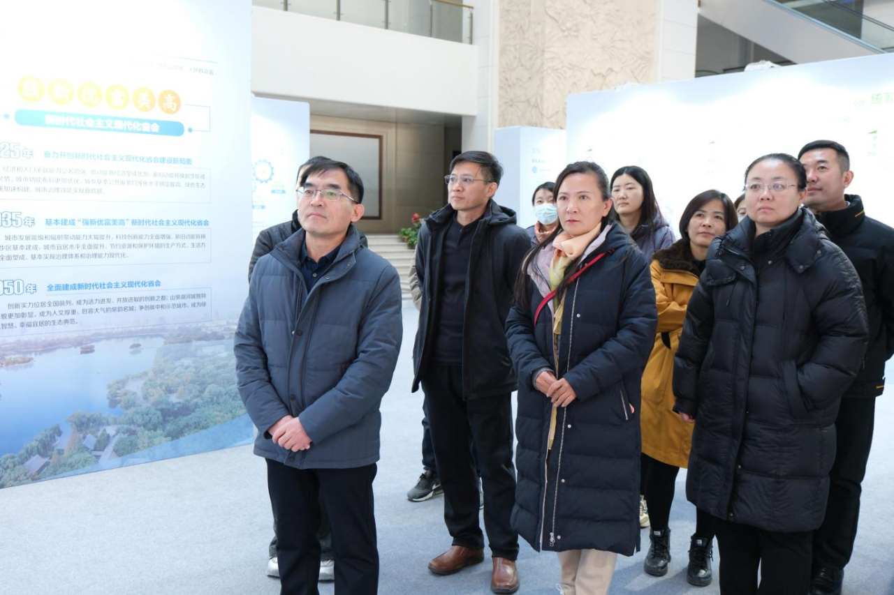 活動中,全體人員有序參觀了“錨定目標 高點定位”“統(tǒng)籌協(xié)調(diào) 優(yōu)化格局”“開放創(chuàng)新 綠色轉(zhuǎn)型”“人民至上 品質(zhì)生活”“文化名城 泉城魅力”“數(shù)字賦能 保障實施”六個篇章。通過豐富的圖片、圖表和視頻展示,大家對濟南市“山東省省會,黃河流域重要的中心城市,國家歷史文化名城,全國性綜合交通樞紐城市”的城市性質(zhì)和“北方先進制造業(yè)基地、北方商貿(mào)物流中心、區(qū)域性科技創(chuàng)新高地”的功能定位有了全方位、深層次的理解與感悟。